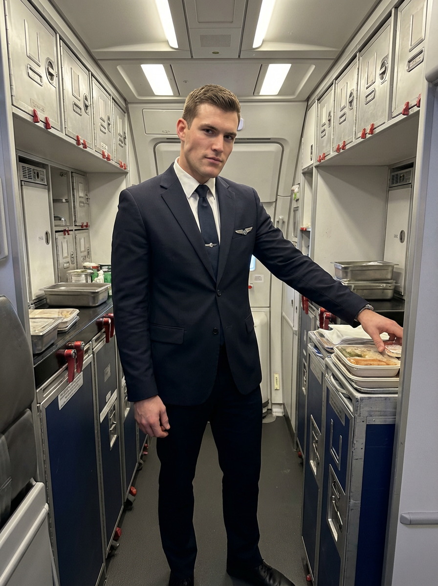 model as a flight attendant in the galley of a modern aircraft, wearing a powerful stance in a well-fitted flight attendant uniform with tie and strong jawline, preparing meal service