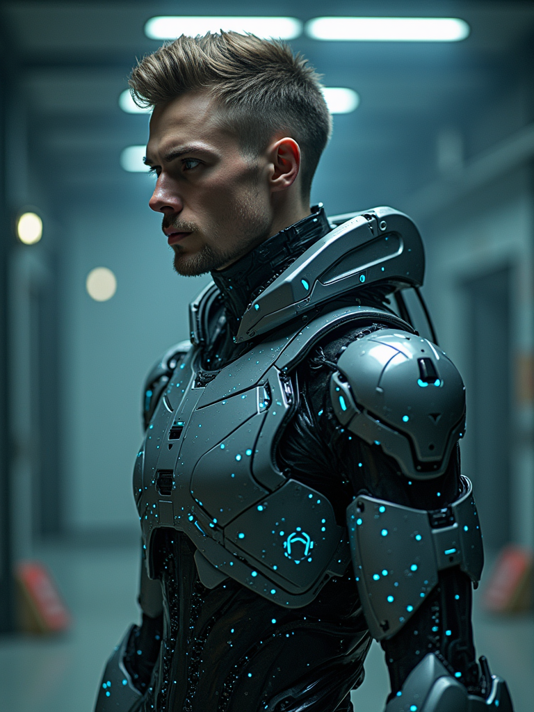 model as a futuristic AI, studio setup, wearing a robotic exoskeleton with glowing circuits, sci-fi lighting and digital effects