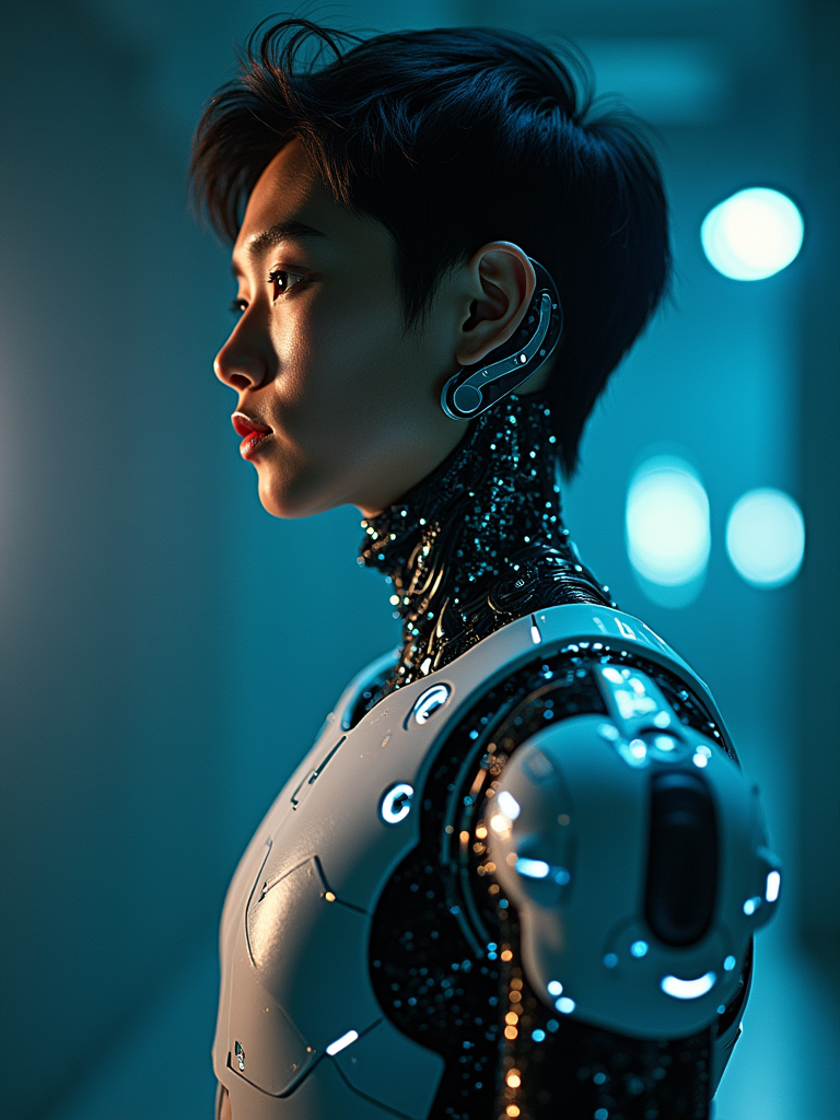 model as a futuristic AI, studio setup, wearing a robotic exoskeleton with glowing circuits, sci-fi lighting and digital effects
