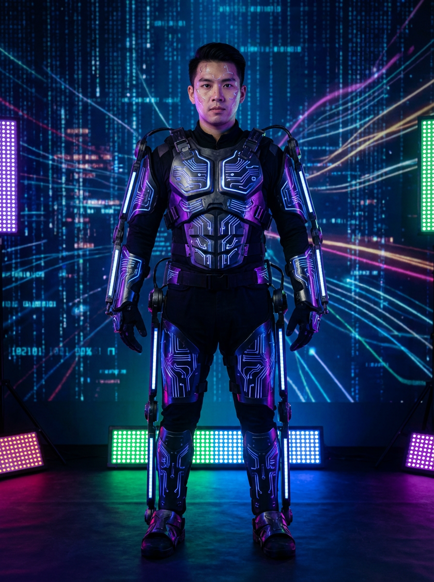 model as a futuristic AI, studio setup, wearing a robotic exoskeleton with glowing circuits, sci-fi lighting and digital effects