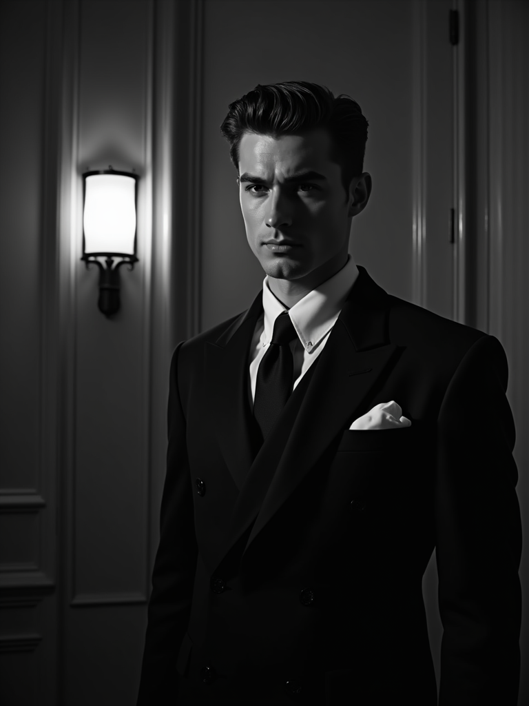 model as a glamorous 1950s noir detective in a dimly lit film set, wearing a sharp tailored suit with wide shoulders, sophisticated slicked-back hair, dramatic lighting creating shadows, high-contrast black and white photography, art deco backdrop