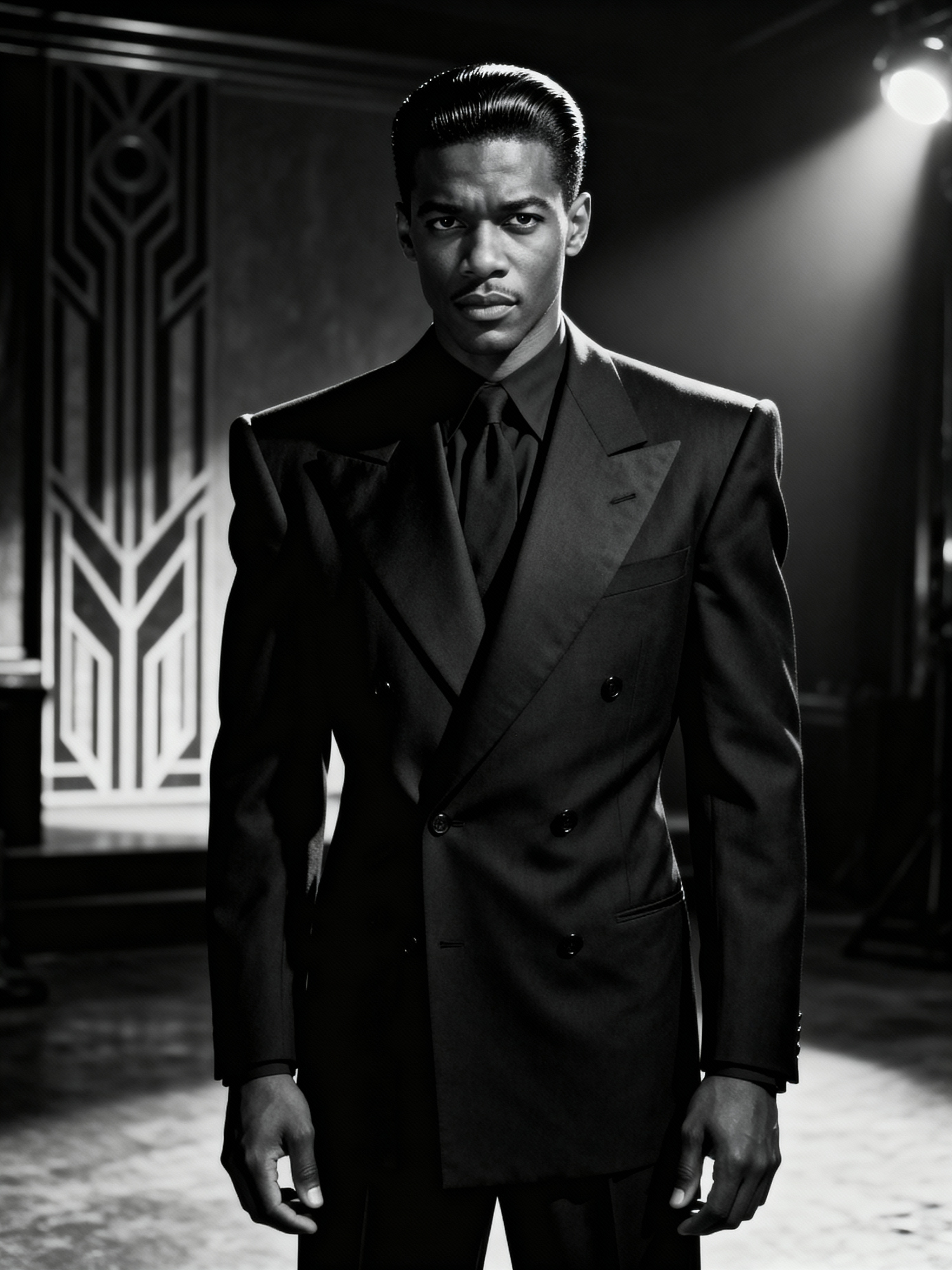 model as a glamorous 1950s noir detective in a dimly lit film set, wearing a sharp tailored suit with wide shoulders, sophisticated slicked-back hair, dramatic lighting creating shadows, high-contrast black and white photography, art deco backdrop