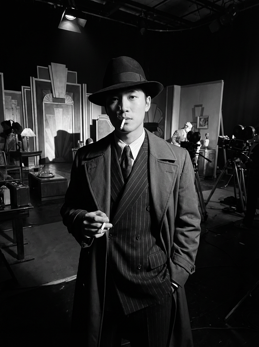 model as a glamorous 1950s noir detective in a dimly lit film set, wearing a sharp tailored suit with wide shoulders, sophisticated slicked-back hair, dramatic lighting creating shadows, high-contrast black and white photography, art deco backdrop