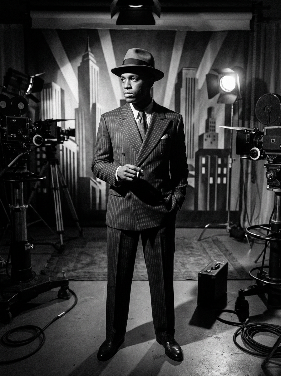 model as a glamorous 1950s noir detective in a dimly lit film set, wearing a sharp tailored suit with wide shoulders, sophisticated slicked-back hair, dramatic lighting creating shadows, high-contrast black and white photography, art deco backdrop