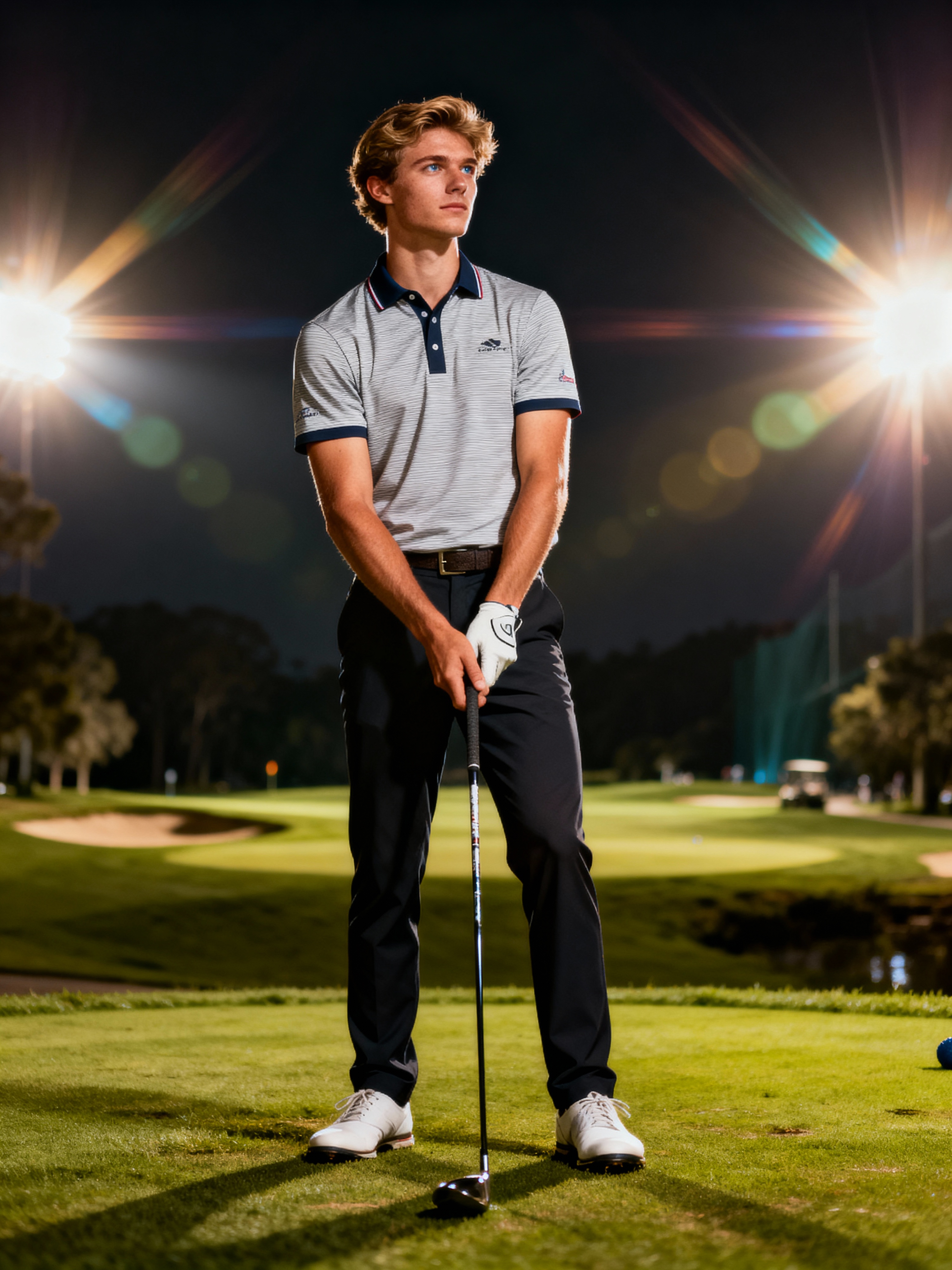model as a Golfer on the Golf Course holding Golf Club wearing golf shorts or golf skirt, a collared shirt, golf pants