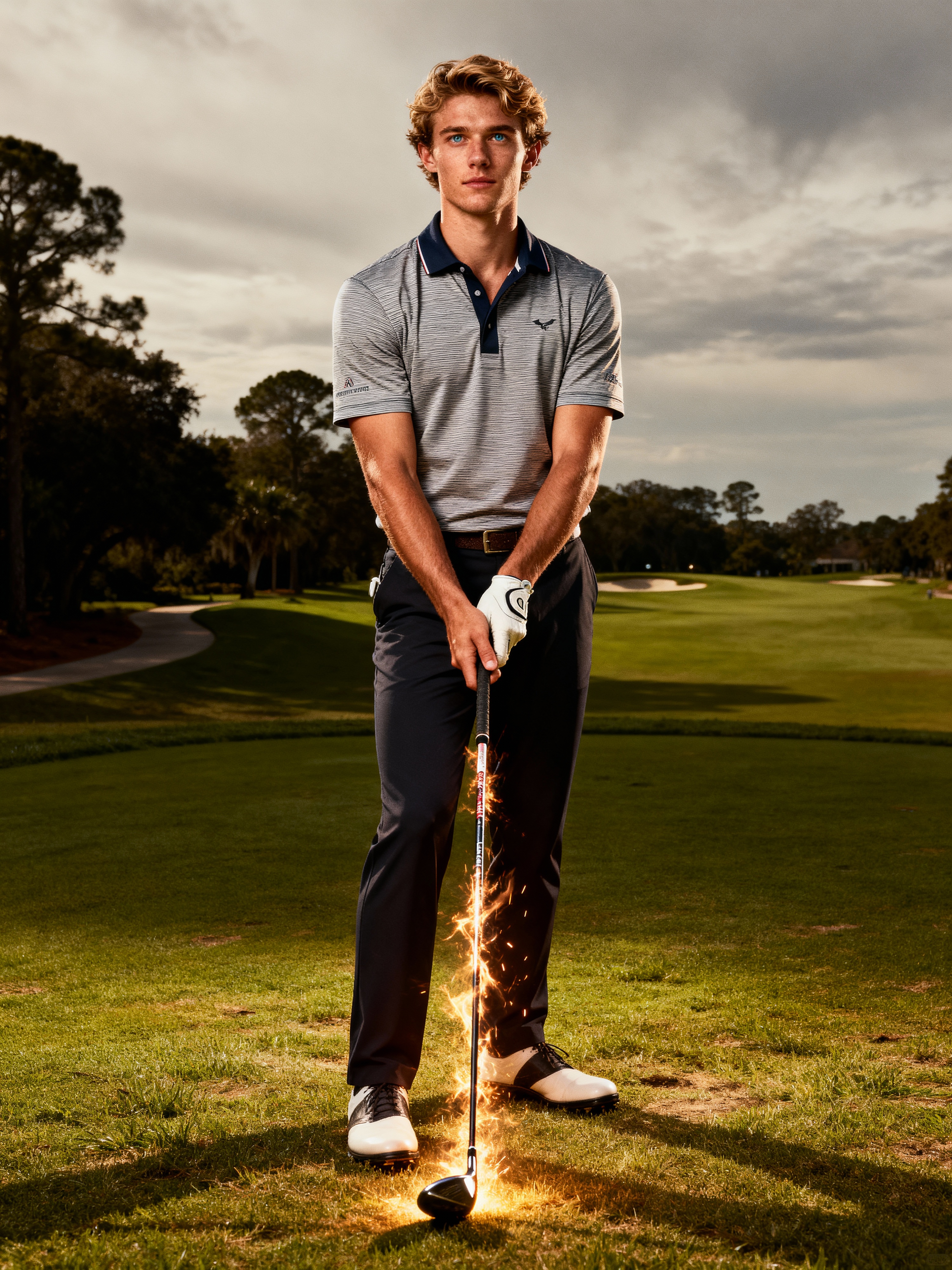 model as a Golfer on the Golf Course holding Golf Club wearing golf shorts or golf skirt, a collared shirt, golf pants