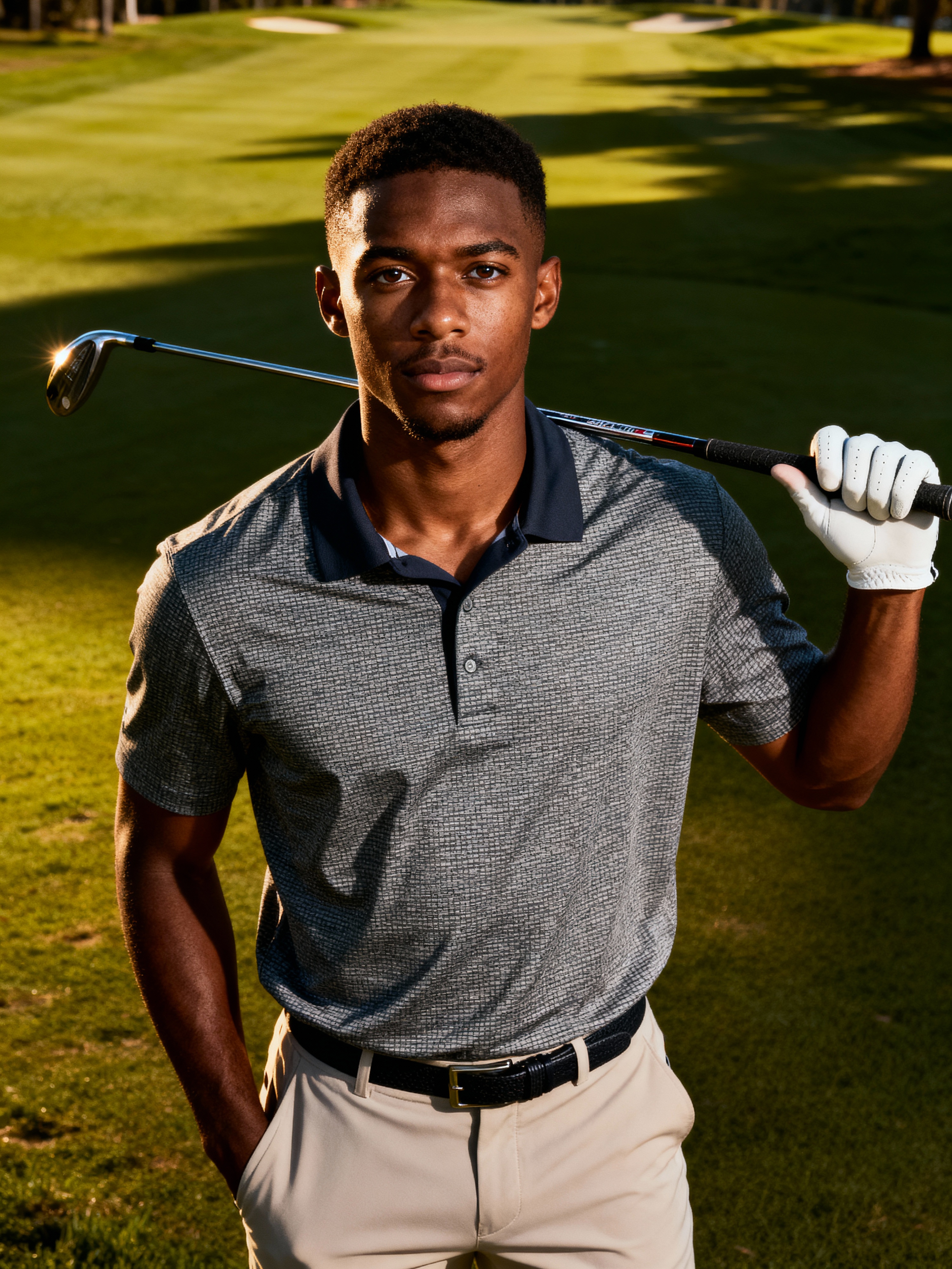 model as a Golfer on the Golf Course holding Golf Club wearing golf shorts or golf skirt, a collared shirt, golf pants