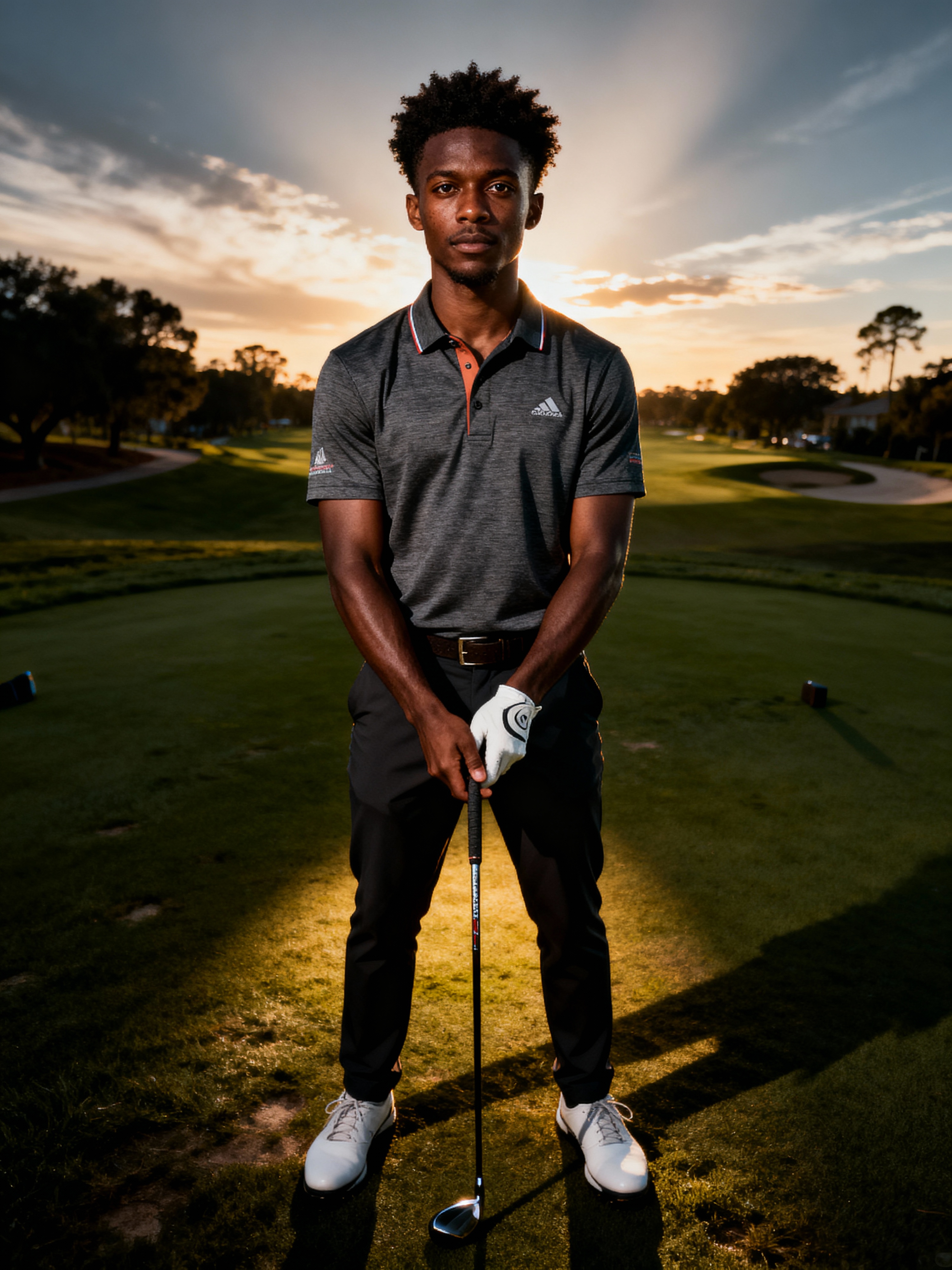 model as a Golfer on the Golf Course holding Golf Club wearing golf shorts or golf skirt, a collared shirt, golf pants