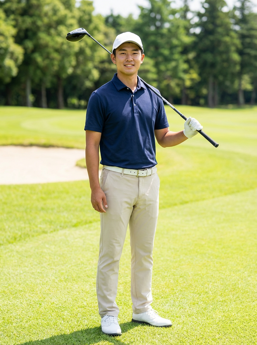 model as a Golfer on the Golf Course holding Golf Club wearing golf shorts or golf skirt, a collared shirt, golf pants