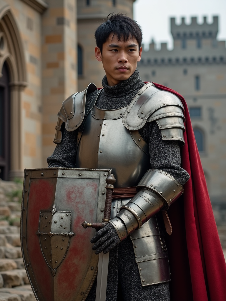 model as a historical character, castle backdrop, wearing a knight's armor with a shield and sword, posing regally