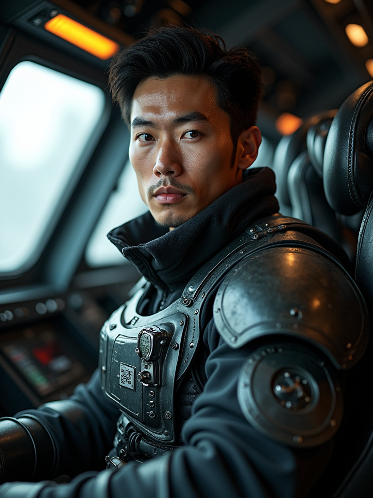 model as a mech pilot, studio setting, wearing a rugged tactical suit with armor plates, dramatic lighting, cockpit background