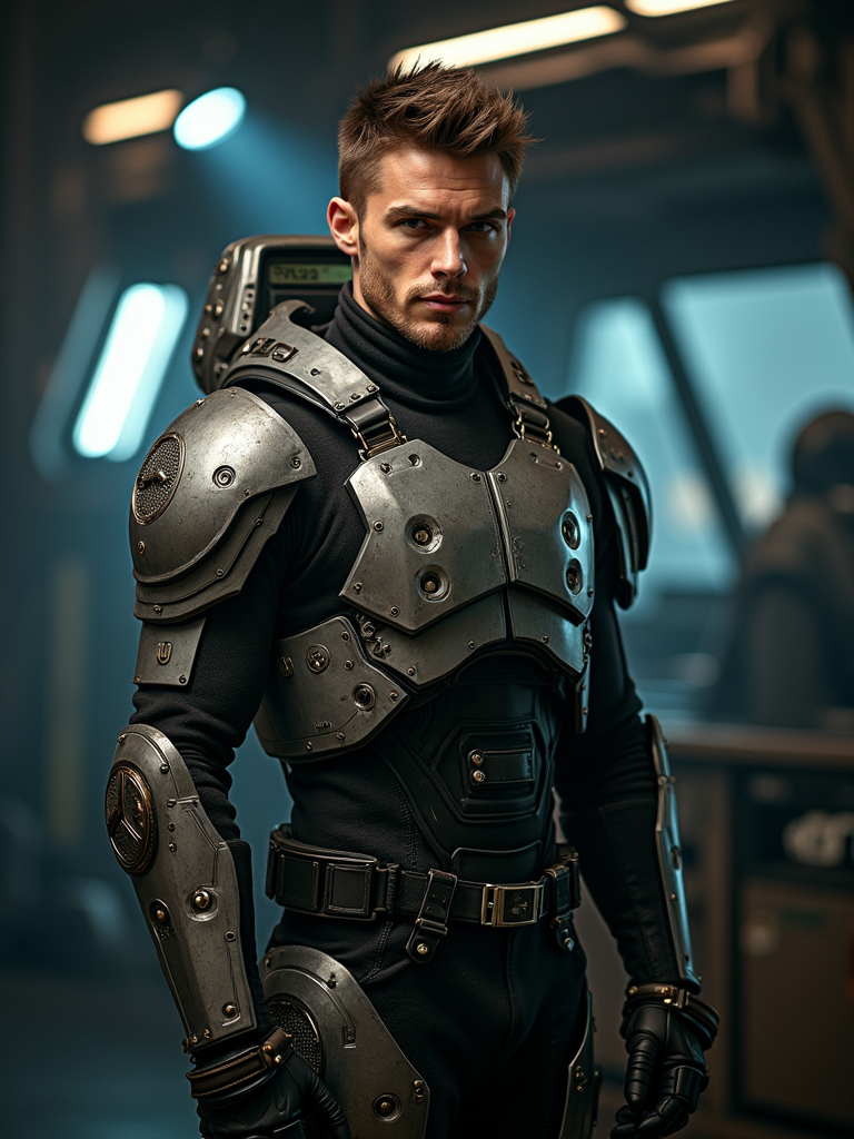 model as a mech pilot, studio setting, wearing a rugged tactical suit with armor plates, dramatic lighting, cockpit background