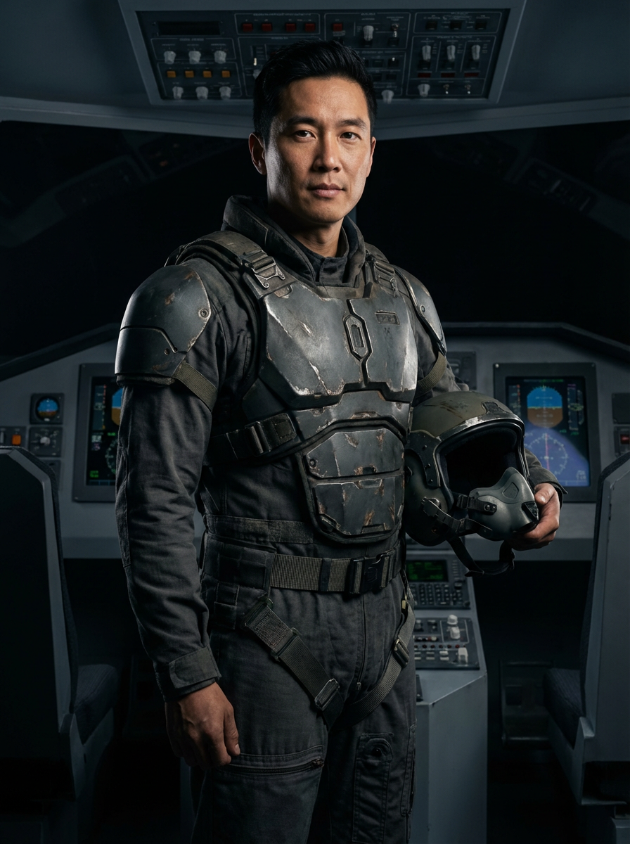 model as a mech pilot, studio setting, wearing a rugged tactical suit with armor plates, dramatic lighting, cockpit background