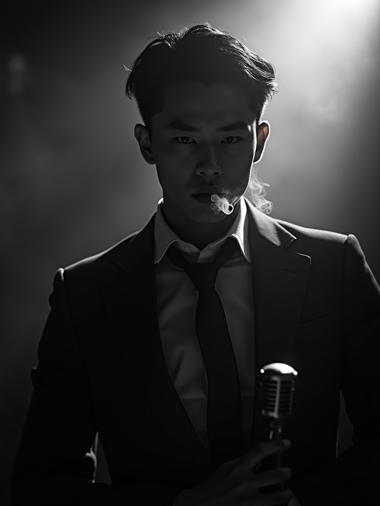model as a mysterious private investigator in a smoky jazz club, wearing a dark suit with loosened tie, moody lighting, cigarette smoke creating atmospheric haze, vintage microphone nearby, black and white film noir aesthetic