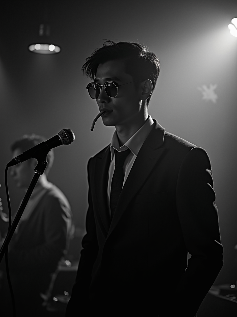 model as a mysterious private investigator in a smoky jazz club, wearing a dark suit with loosened tie, moody lighting, cigarette smoke creating atmospheric haze, vintage microphone nearby, black and white film noir aesthetic