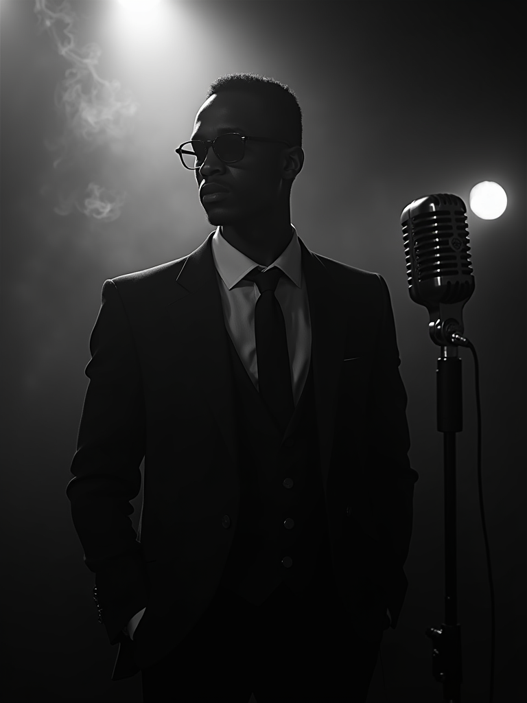 model as a mysterious private investigator in a smoky jazz club, wearing a dark suit with loosened tie, moody lighting, cigarette smoke creating atmospheric haze, vintage microphone nearby, black and white film noir aesthetic