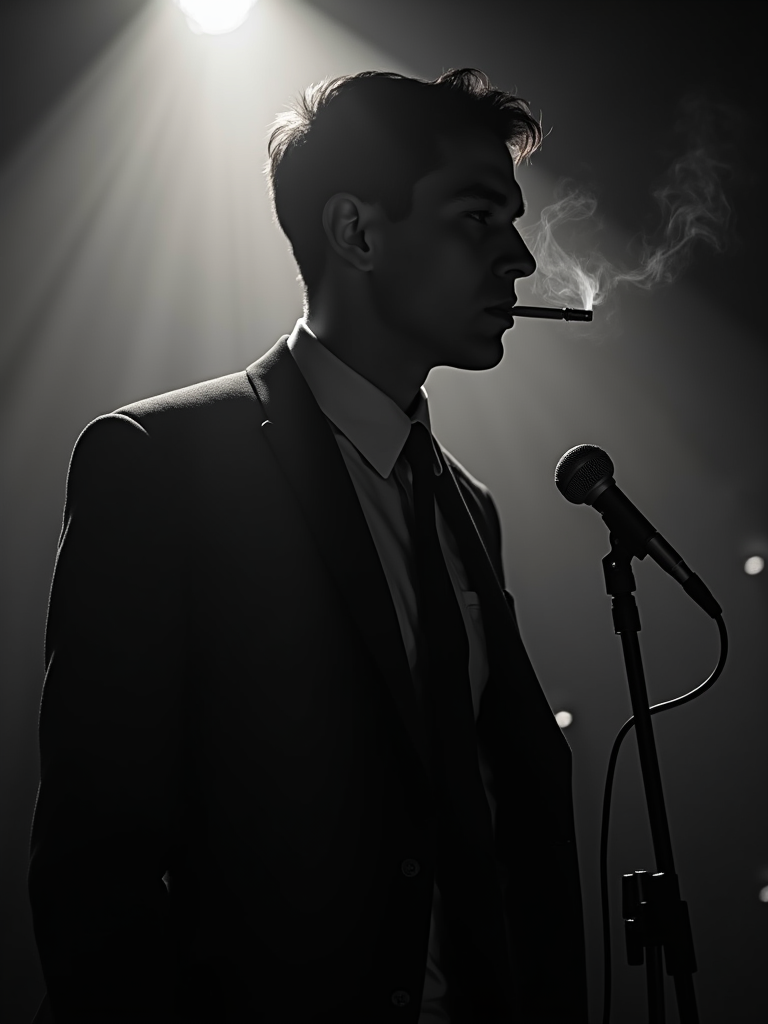 model as a mysterious private investigator in a smoky jazz club, wearing a dark suit with loosened tie, moody lighting, cigarette smoke creating atmospheric haze, vintage microphone nearby, black and white film noir aesthetic