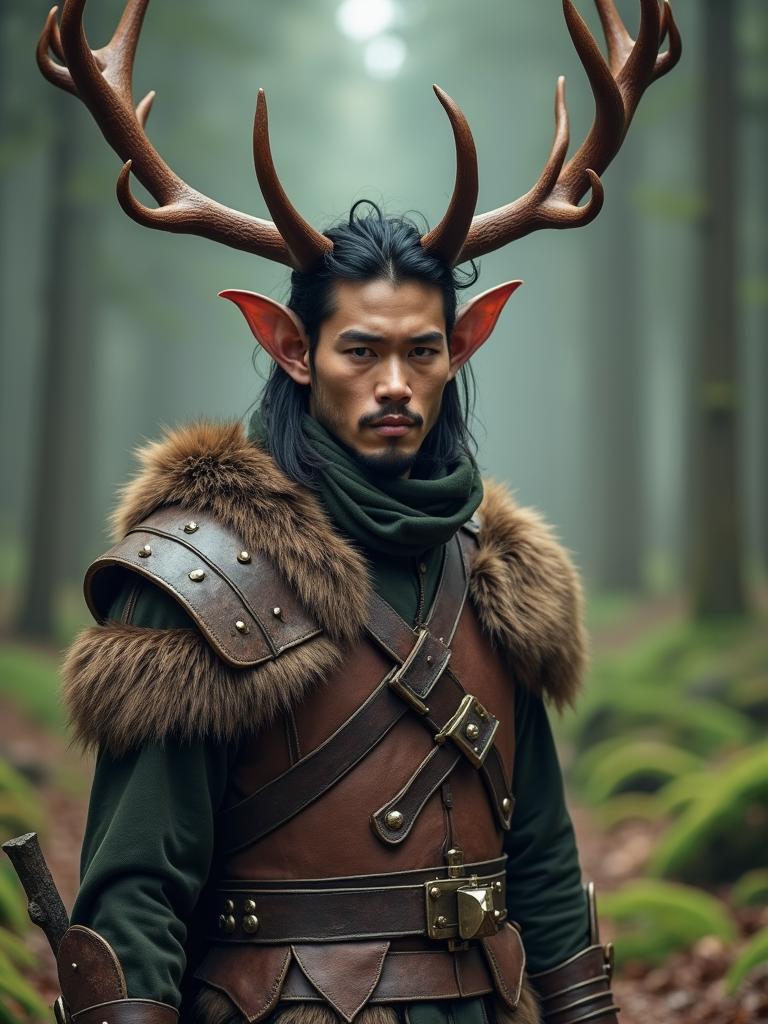 model as a mythical creature, outdoors in a mystical setting, wearing a forest guardian costume with wooden armor and antlers, magical atmosphere