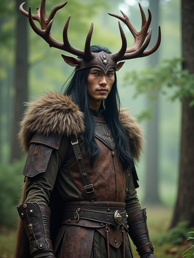 model as a mythical creature, outdoors in a mystical setting, wearing a forest guardian costume with wooden armor and antlers, magical atmosphere