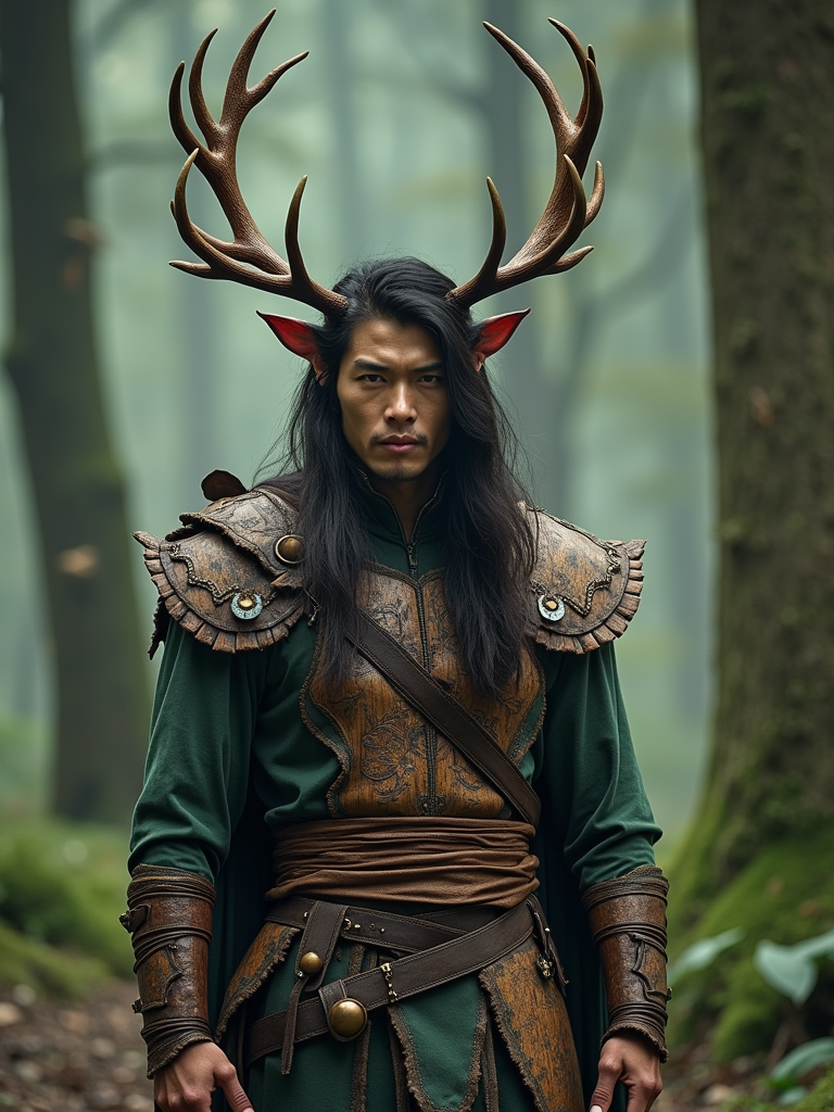 model as a mythical creature, outdoors in a mystical setting, wearing a forest guardian costume with wooden armor and antlers, magical atmosphere