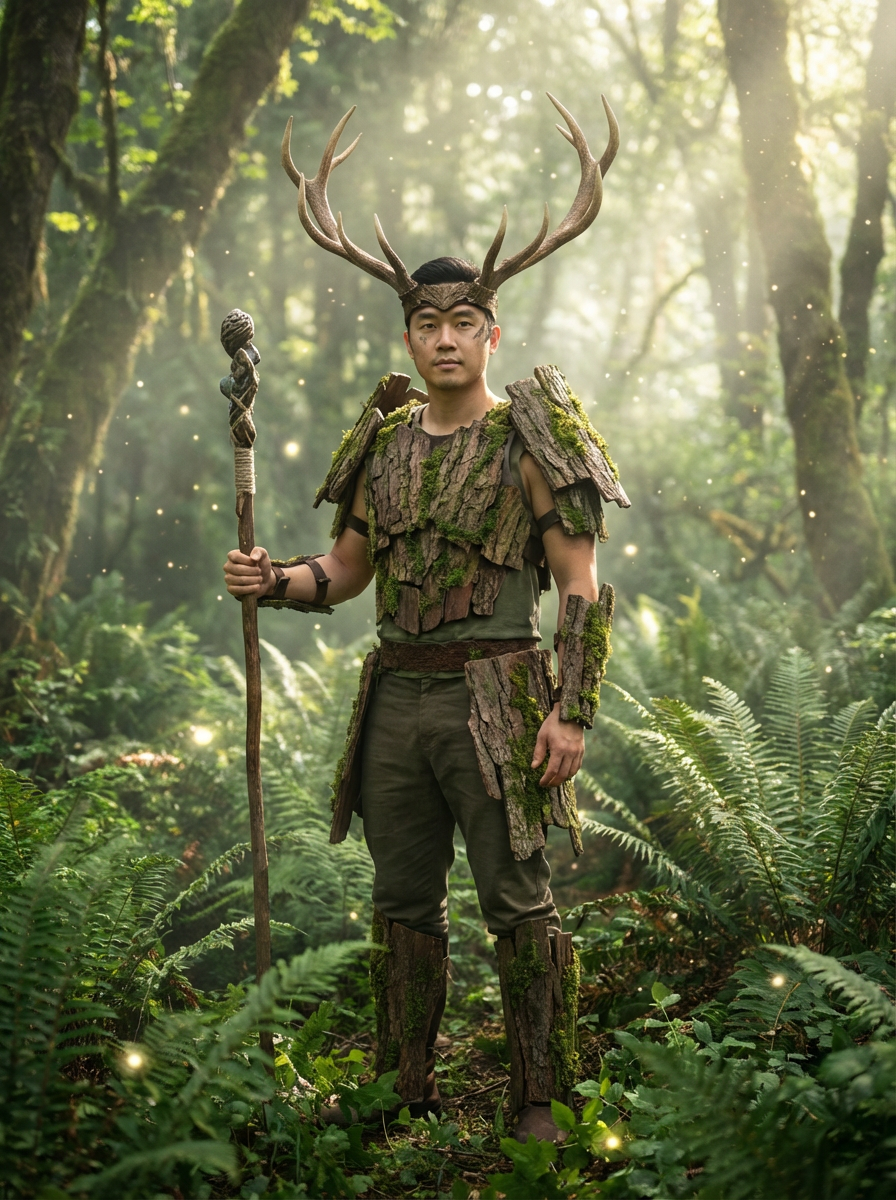model as a mythical creature, outdoors in a mystical setting, wearing a forest guardian costume with wooden armor and antlers, magical atmosphere