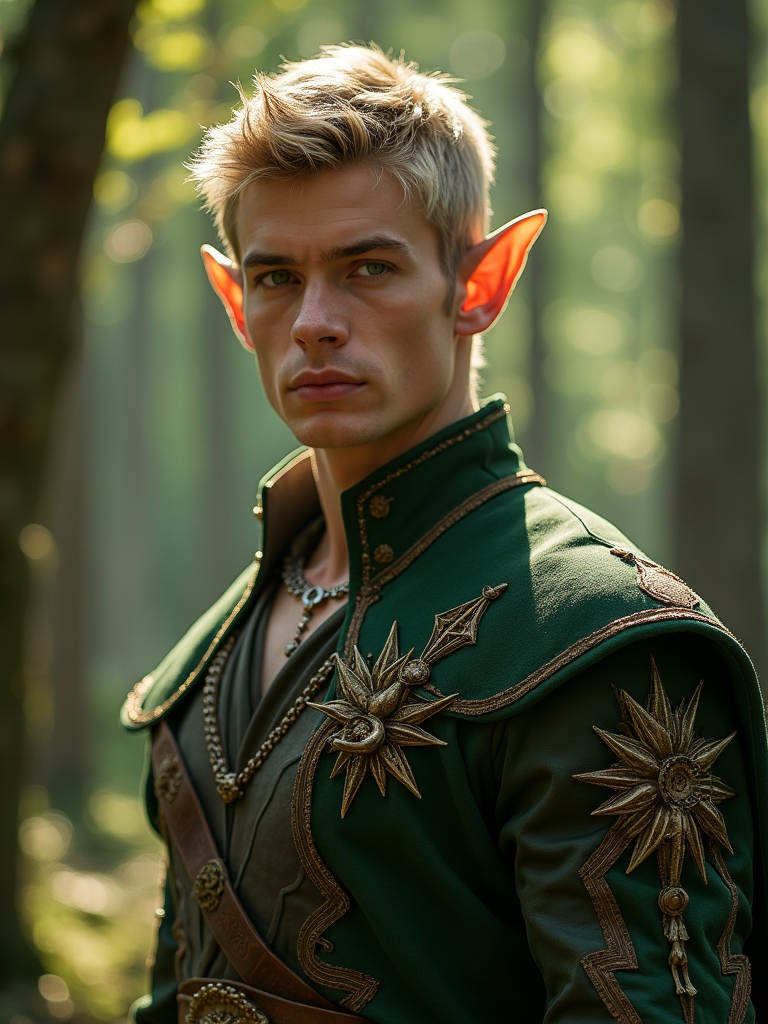 model as a noble elf prince with pointed ears wearing royal fantasy attire in an enchanted forest with glowing magical light filtering through ancient trees