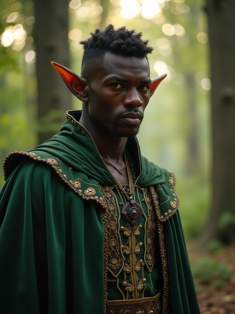 model as a noble elf prince with pointed ears wearing royal fantasy attire in an enchanted forest with glowing magical light filtering through ancient trees