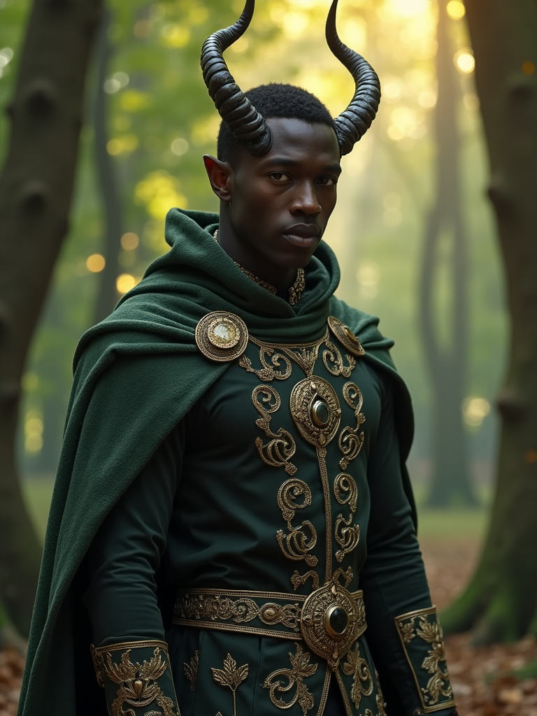 model as a noble elf prince with pointed ears wearing royal fantasy attire in an enchanted forest with glowing magical light filtering through ancient trees
