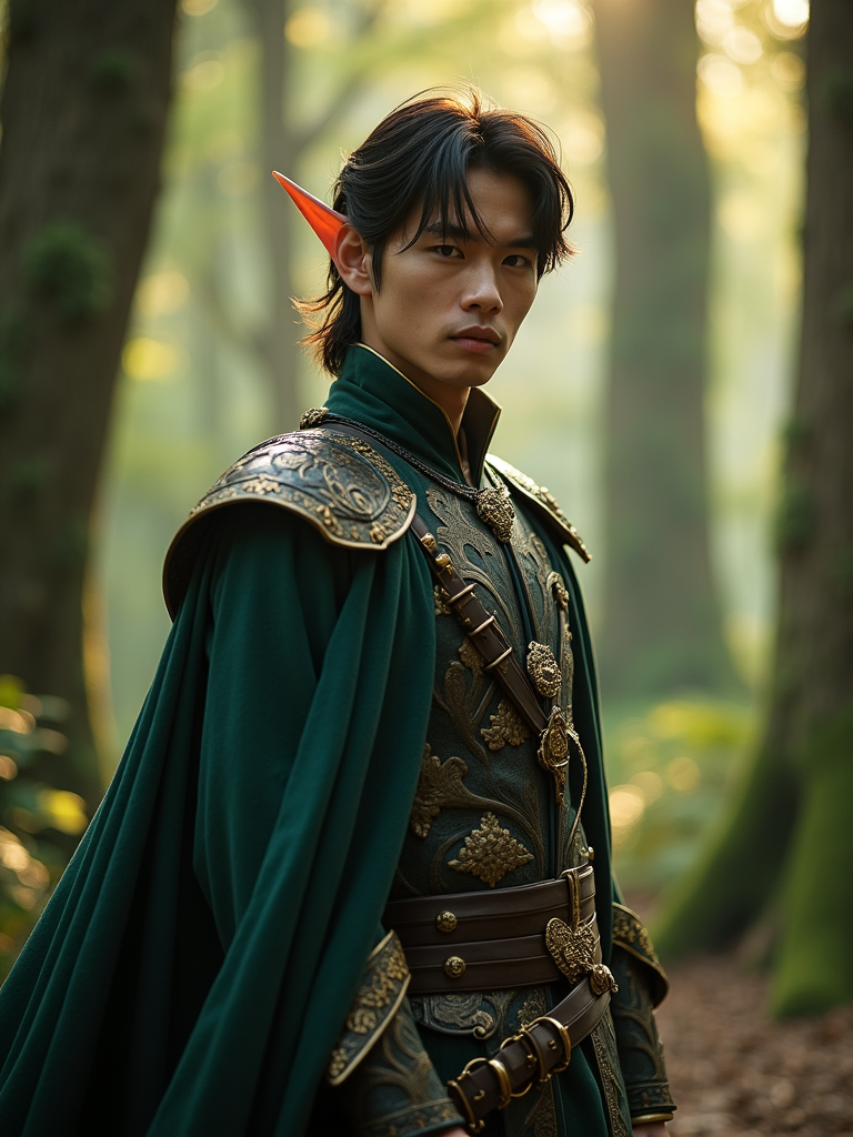 model as a noble elf prince with pointed ears wearing royal fantasy attire in an enchanted forest with glowing magical light filtering through ancient trees