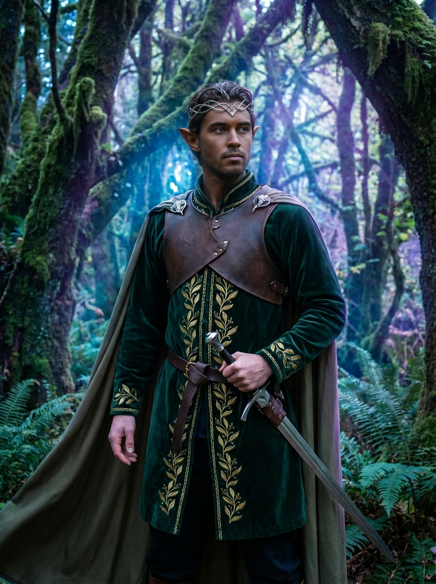 model as a noble elf prince with pointed ears wearing royal fantasy attire in an enchanted forest with glowing magical light filtering through ancient trees