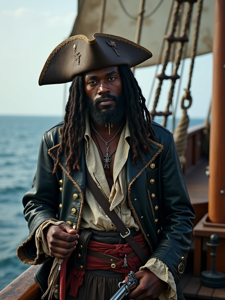 model as a pirate, on a ship deck set, wearing a rugged pirate with a leather coat and pistol, dramatic ocean-themed props