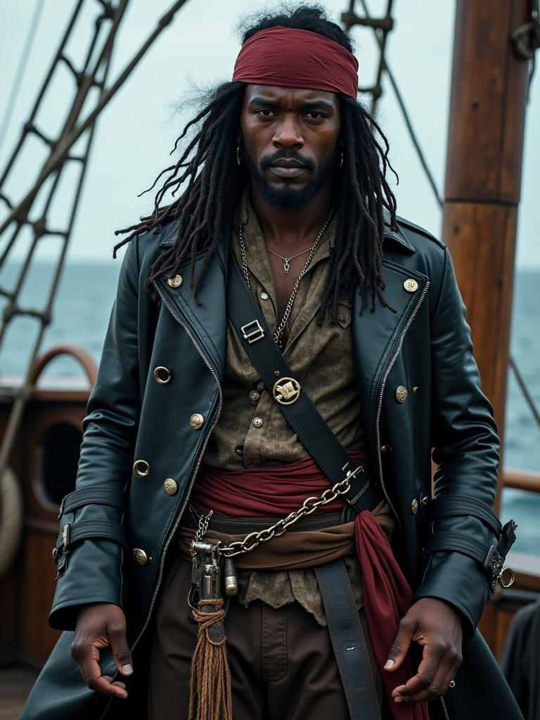 model as a pirate, on a ship deck set, wearing a rugged pirate with a leather coat and pistol, dramatic ocean-themed props