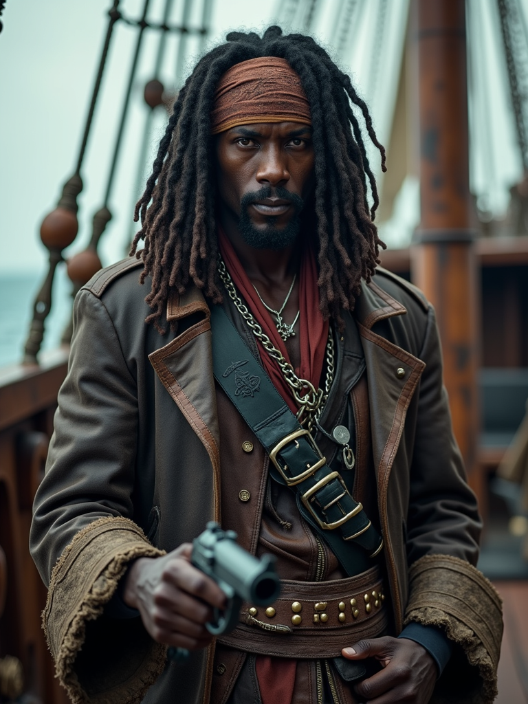 model as a pirate, on a ship deck set, wearing a rugged pirate with a leather coat and pistol, dramatic ocean-themed props
