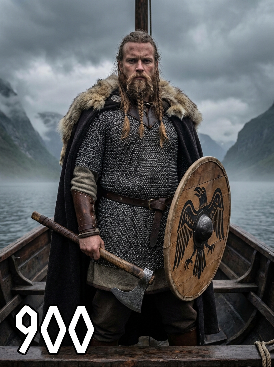 model as a powerful Viking warrior with long braided hair and beard, wearing chainmail armor over wool tunic, leather bracers, and fur-lined cloak standing on the deck of a longship with carved dragon head, surrounded by misty fjords and dramatic Nordic landscape under stormy skies, holding traditional weapons and wooden shield with Norse symbols, text overlay in bottom corner reading "900" in white sans serif font with black outline