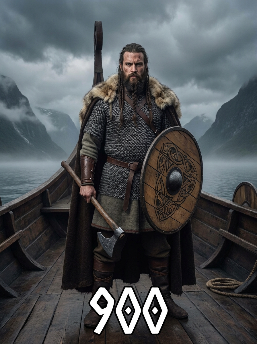 model as a powerful Viking warrior with long braided hair and beard, wearing chainmail armor over wool tunic, leather bracers, and fur-lined cloak standing on the deck of a longship with carved dragon head, surrounded by misty fjords and dramatic Nordic landscape under stormy skies, holding traditional weapons and wooden shield with Norse symbols, text overlay in bottom corner reading "900" in white sans serif font with black outline