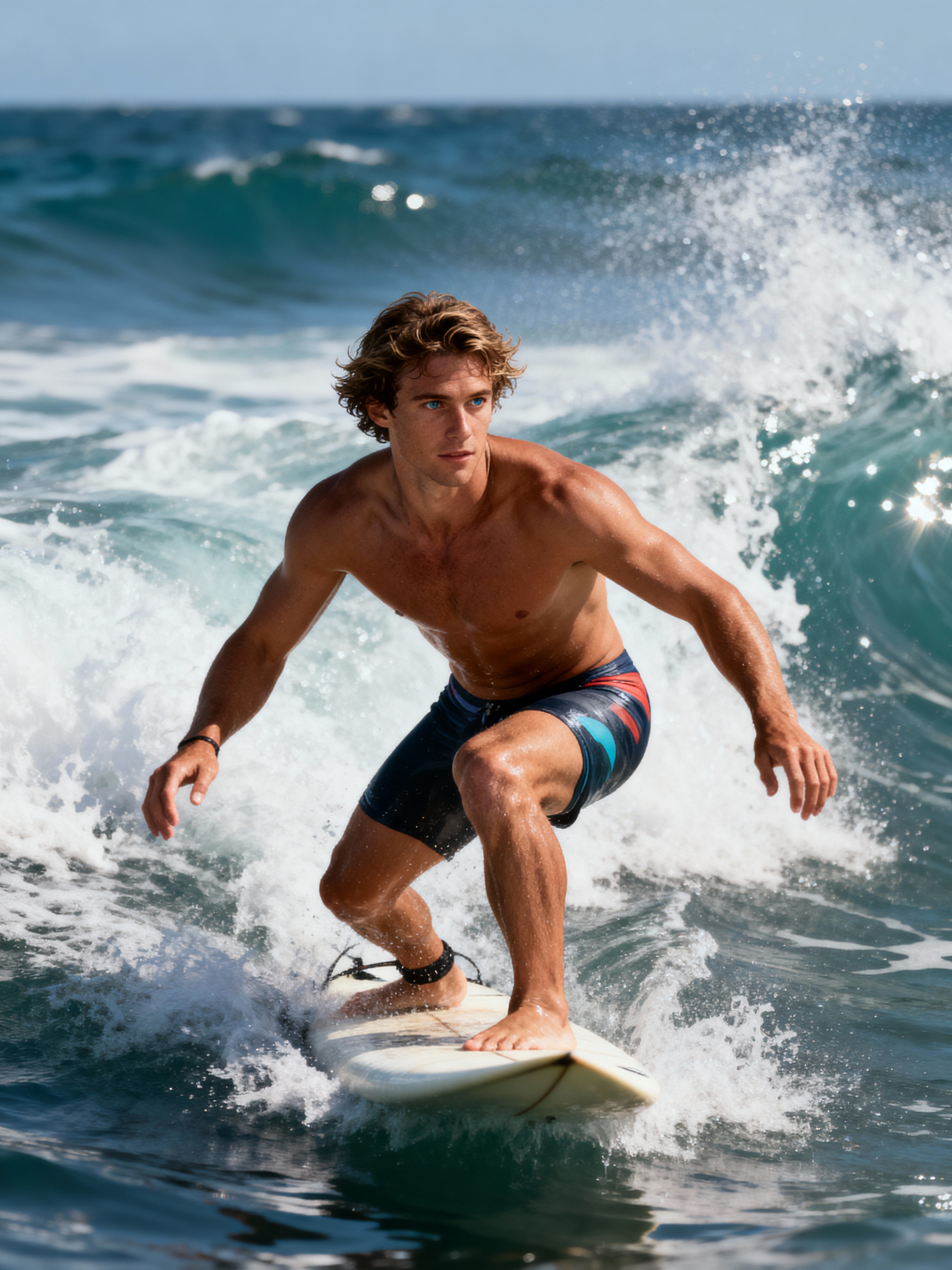 model as a Professional Surfer wearing swimwear on a Surf Board surfing in the ocean