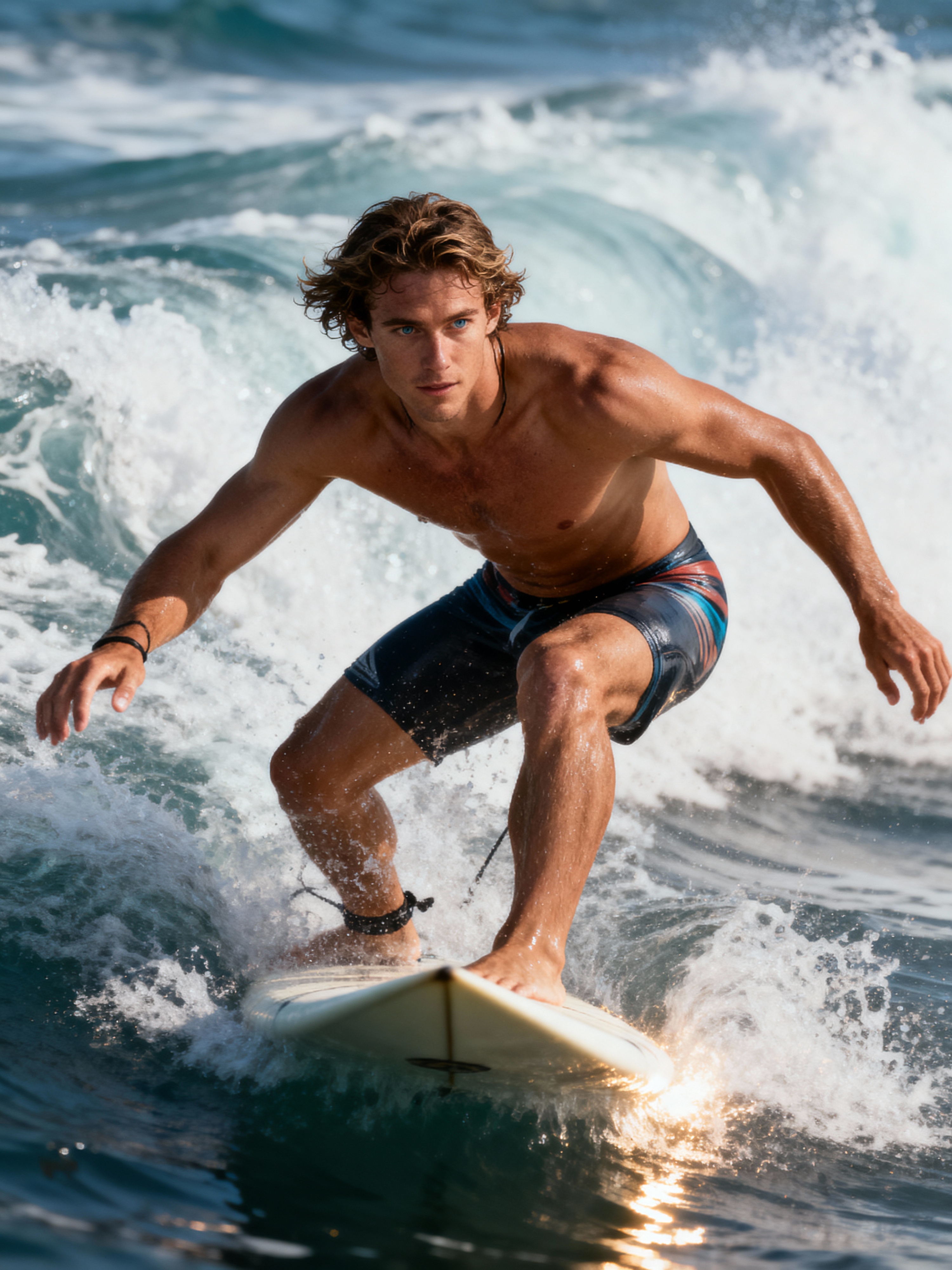 model as a Professional Surfer wearing swimwear on a Surf Board surfing in the ocean