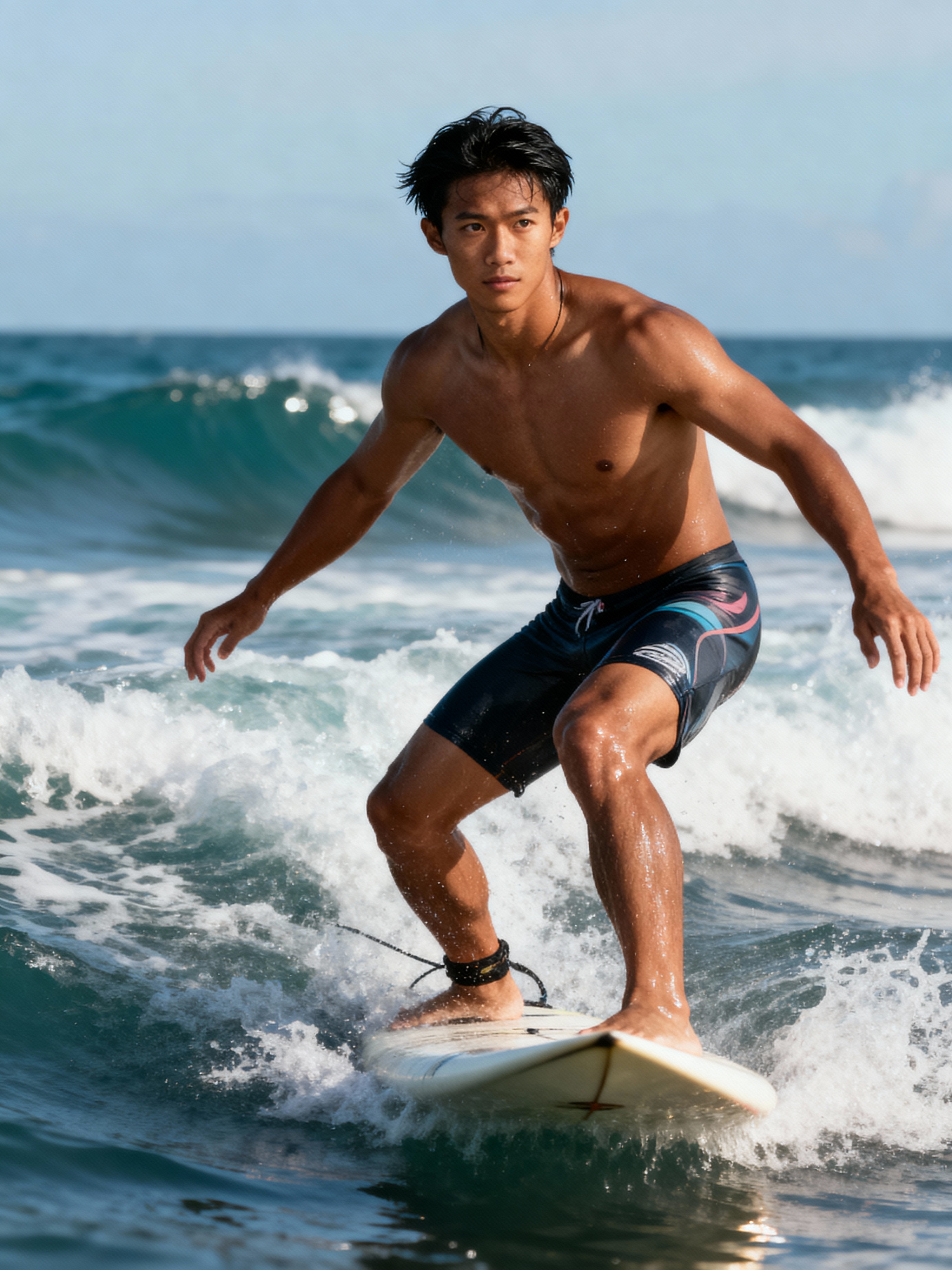 model as a Professional Surfer wearing swimwear on a Surf Board surfing in the ocean