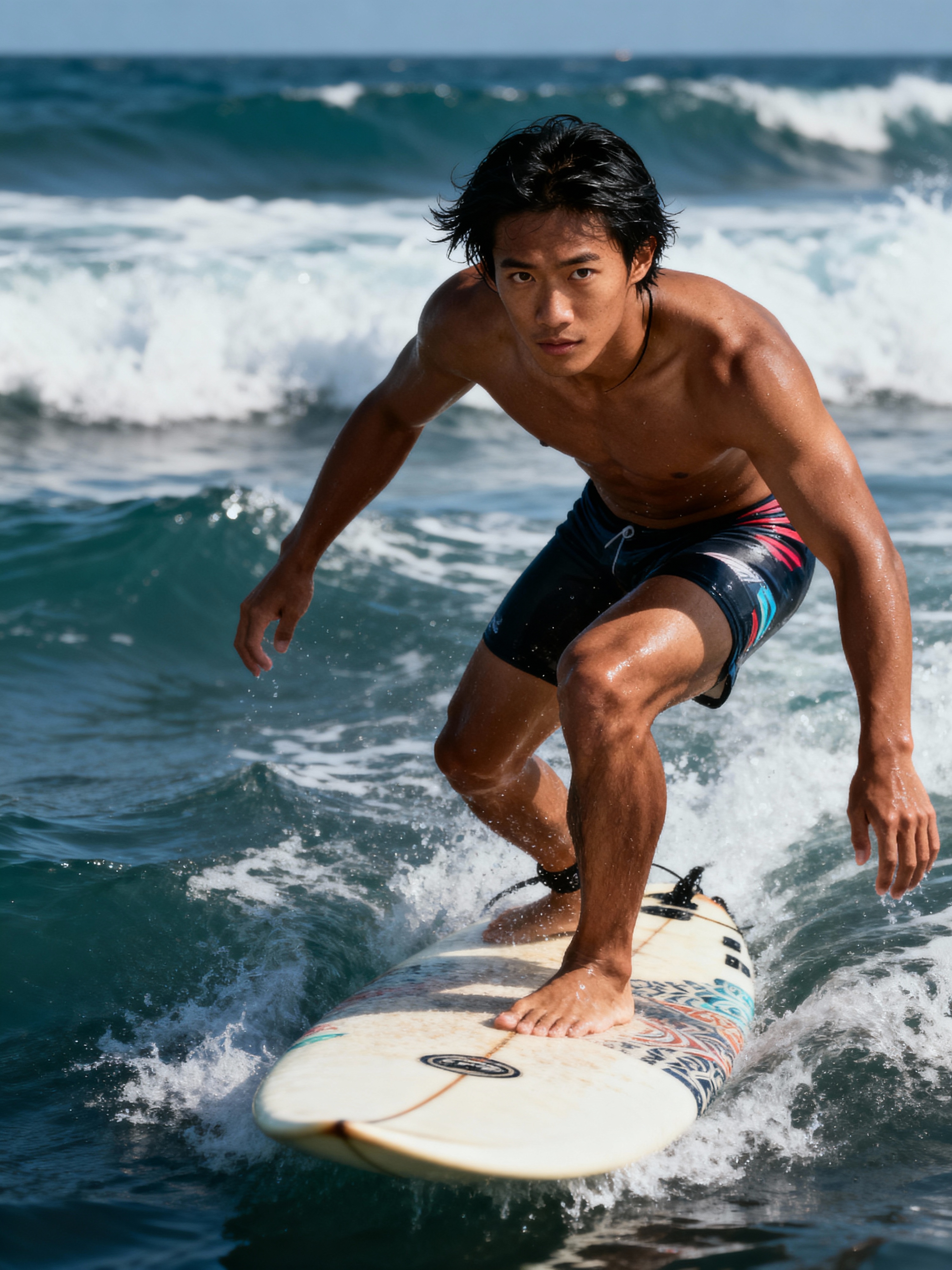 model as a Professional Surfer wearing swimwear on a Surf Board surfing in the ocean