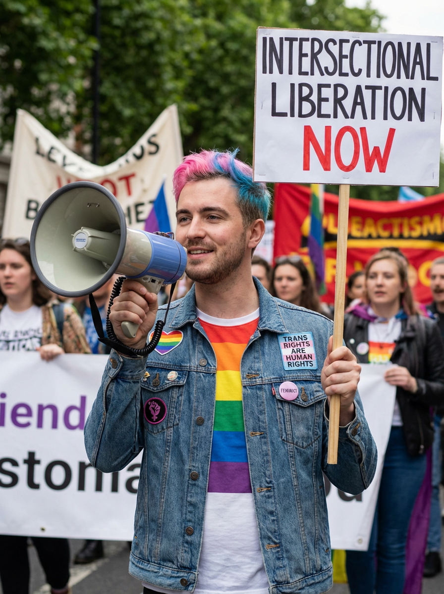 model as a progressive LGBTQ activist feminist with pink or blue hair