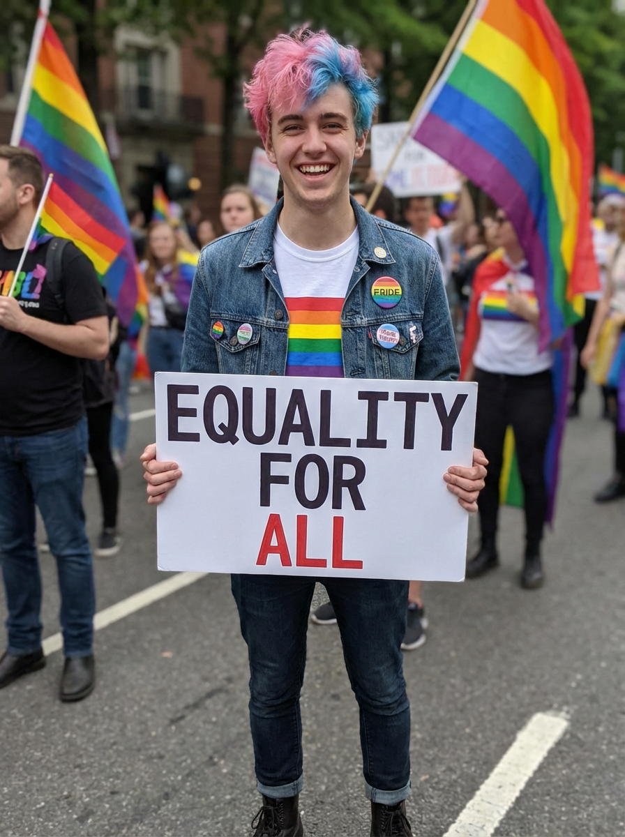model as a progressive LGBTQ activist with pink or blue hair