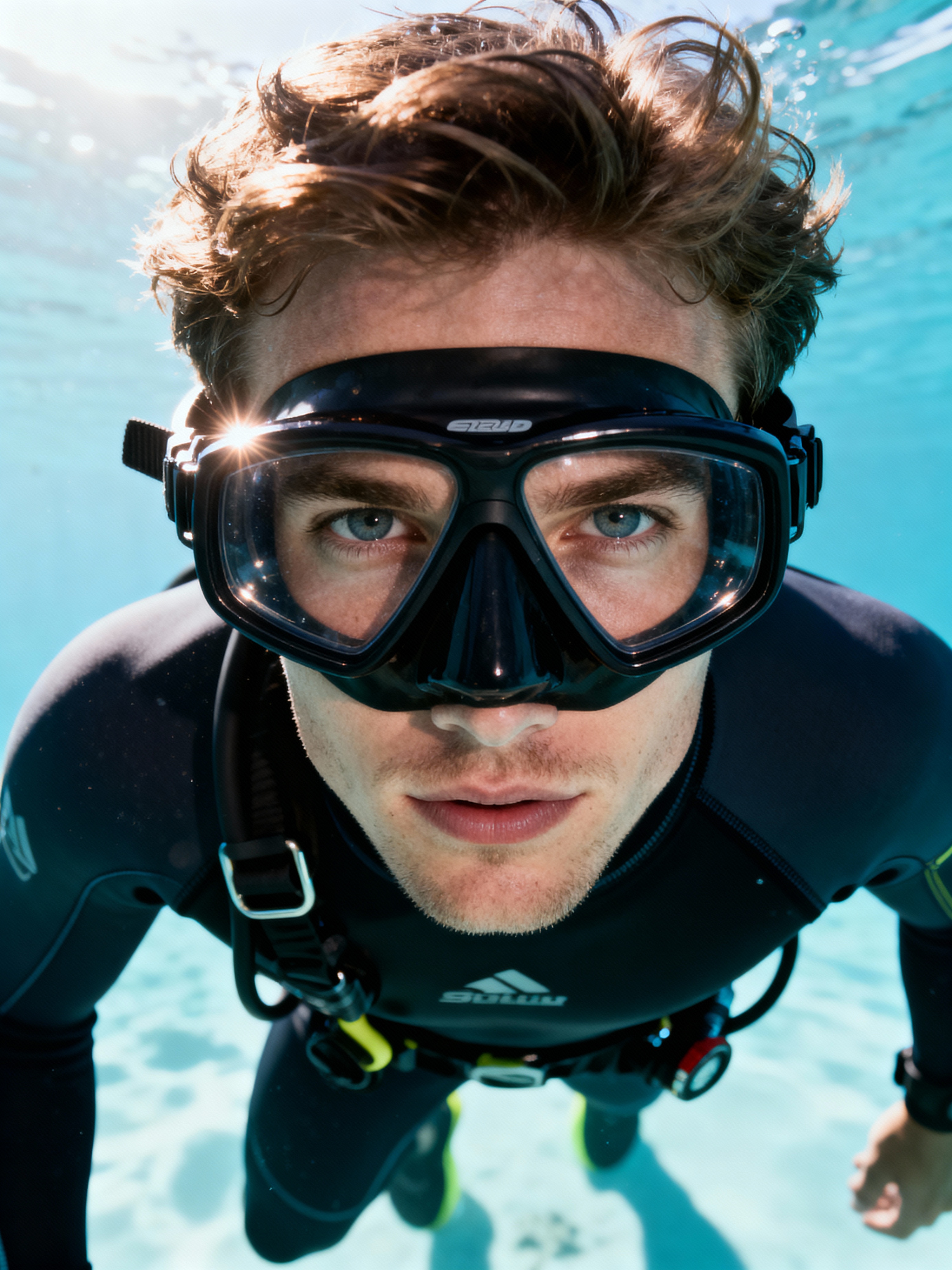 model as a scuba diver wearing diving goggles and wearing a wetsuit