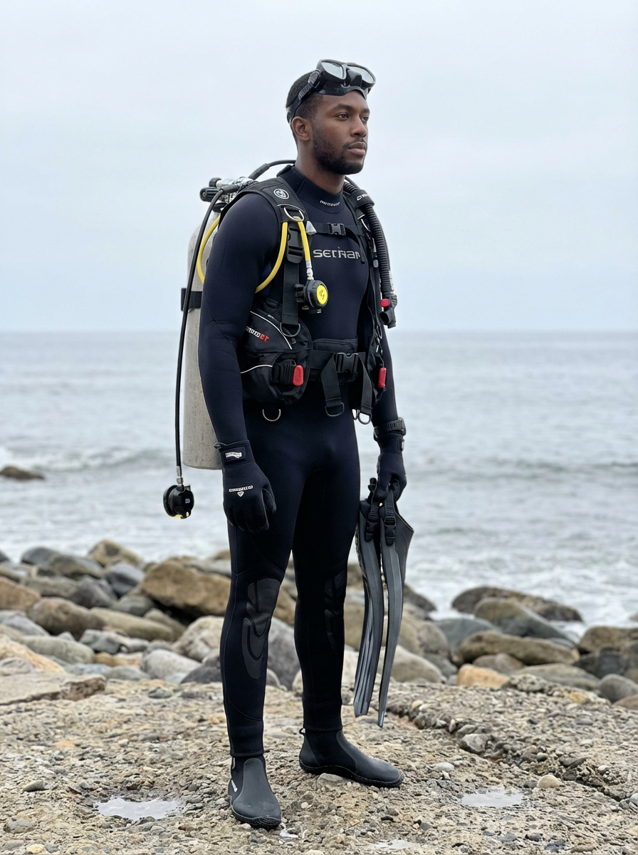 model as a scuba diver wearing diving goggles and wearing a wetsuit