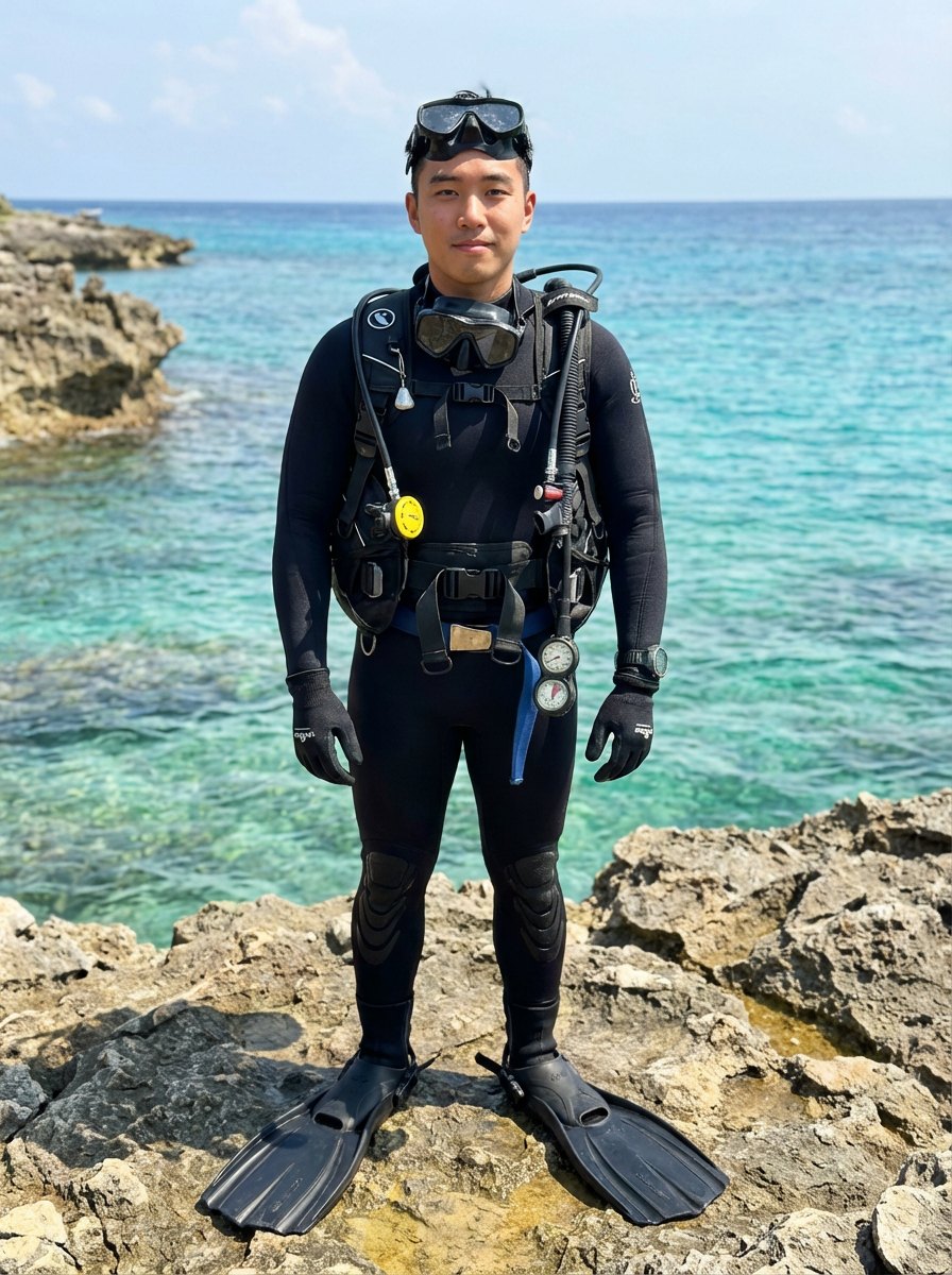model as a scuba diver wearing diving goggles and wearing a wetsuit