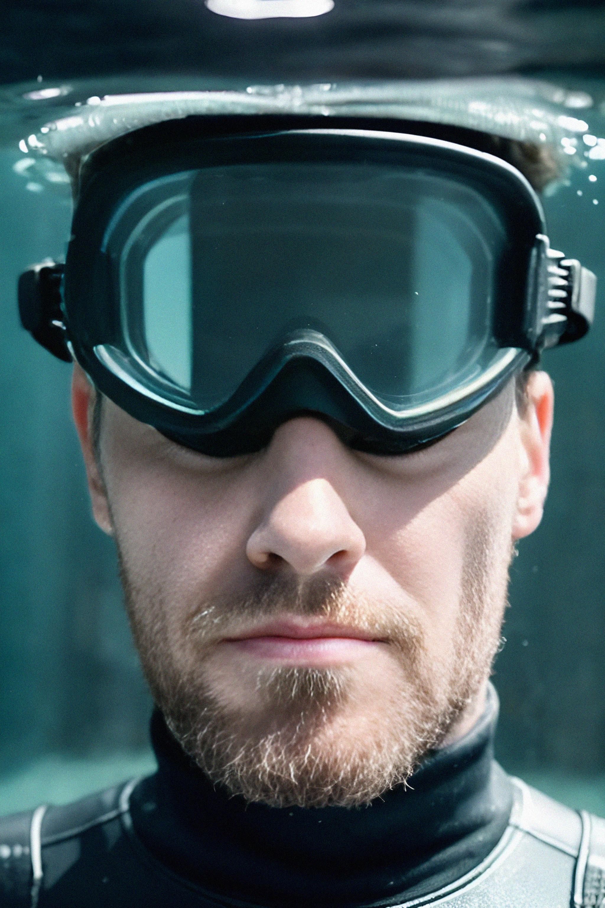 model as a scuba diver wearing diving goggles and wearing a wetsuit