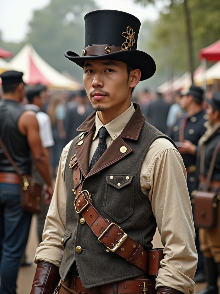 model as a steampunk adventurer, outdoors at a themed event, wearing a vest with gears and a top hat, surrounded by steampunk props and gears