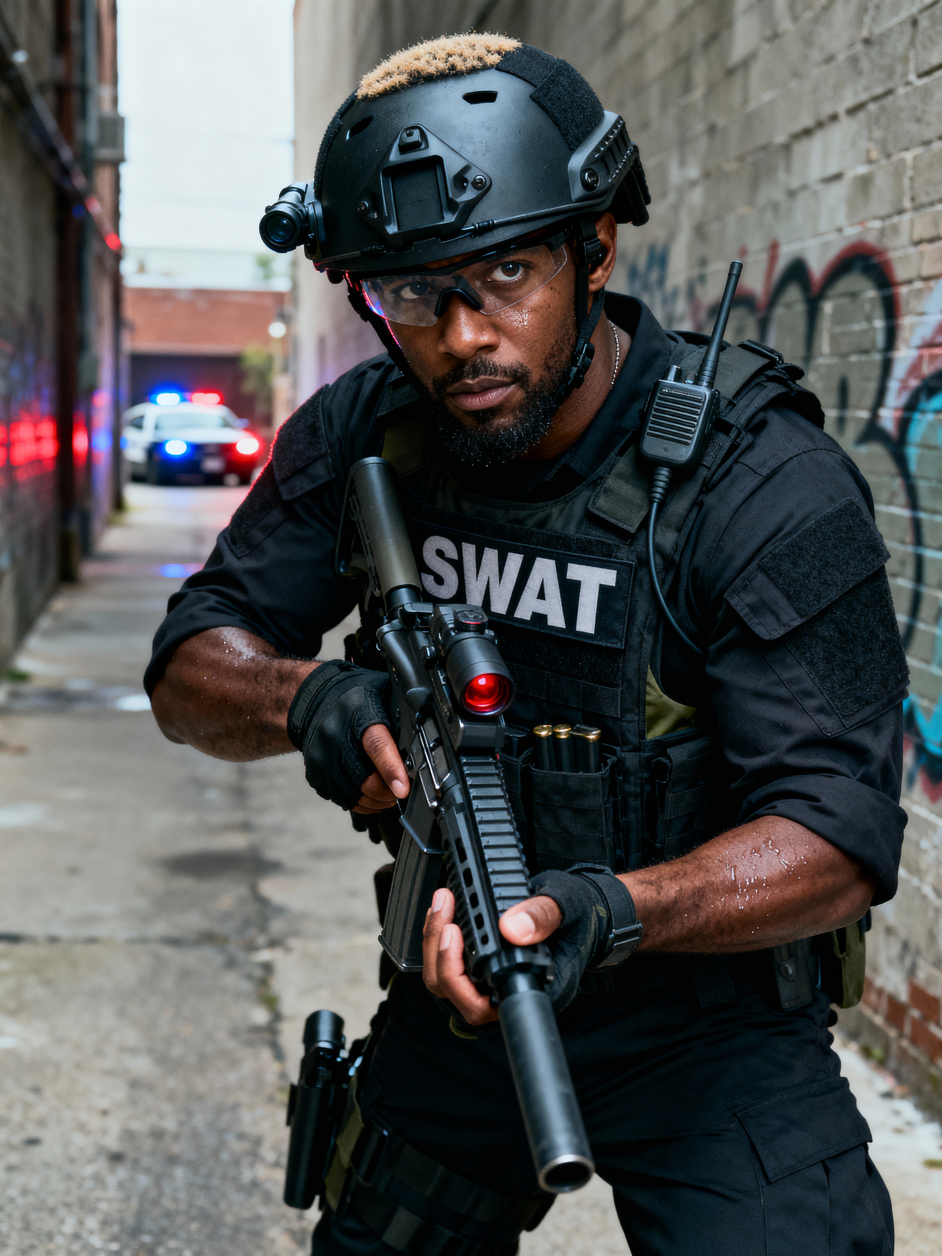 model as a SWAT Officer. wearing black swat vest, swat helmet, holding pdw