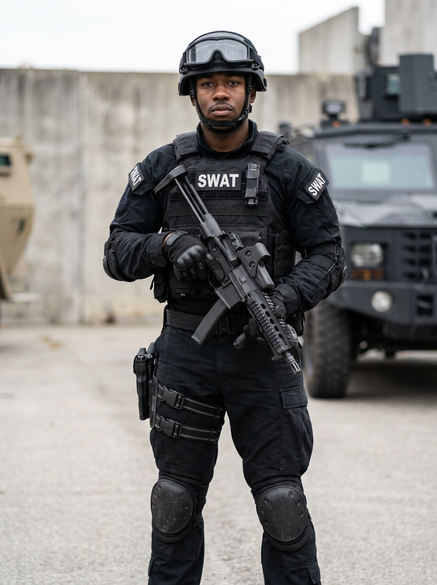 model as a SWAT Officer. wearing black swat vest, swat helmet, holding pdw