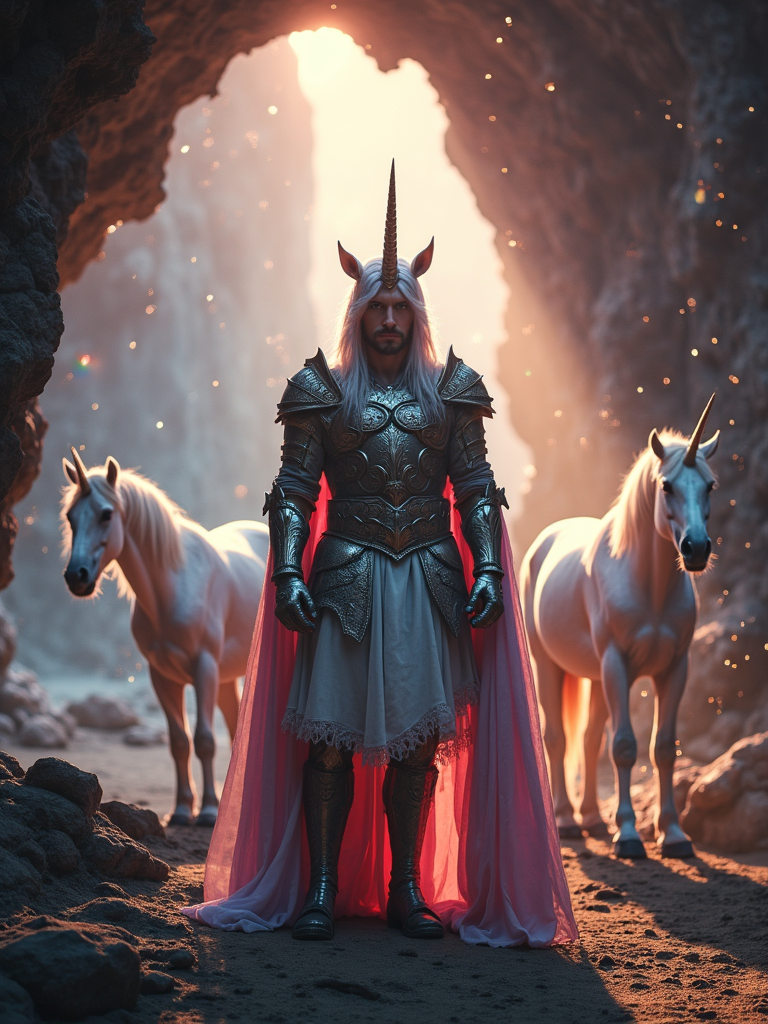 model as a unicorn guardian in mystical armor in a crystal cave with a family of unicorns, prismatic light creating rainbow reflections everywhere