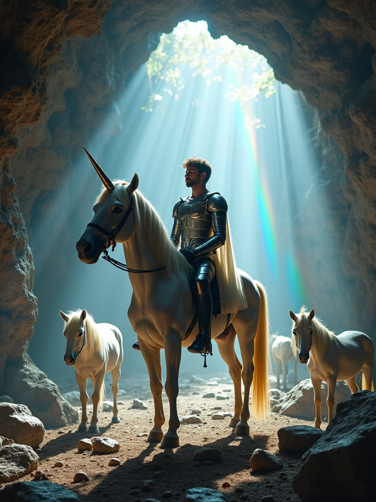 model as a unicorn guardian in mystical armor in a crystal cave with a family of unicorns, prismatic light creating rainbow reflections everywhere